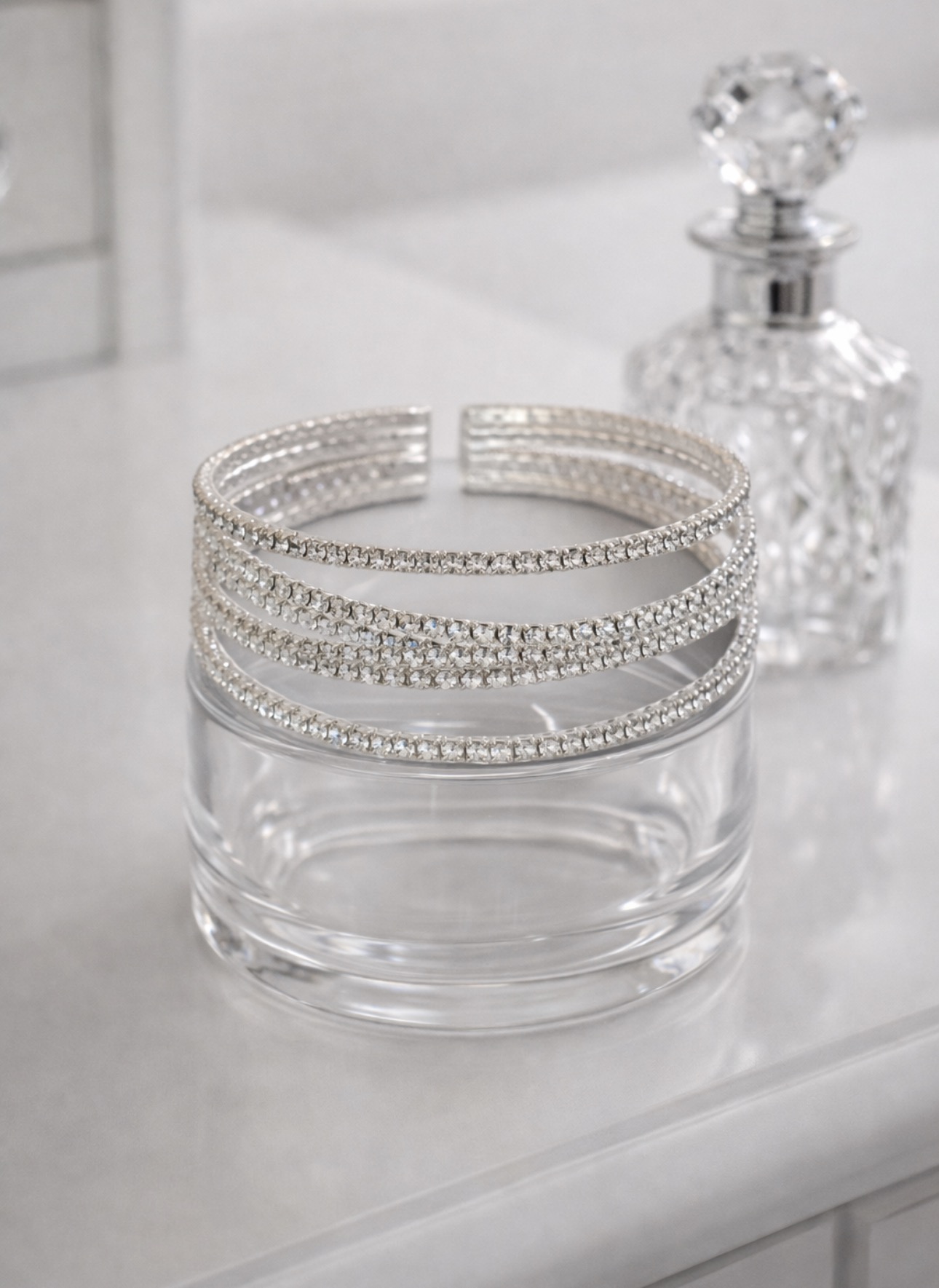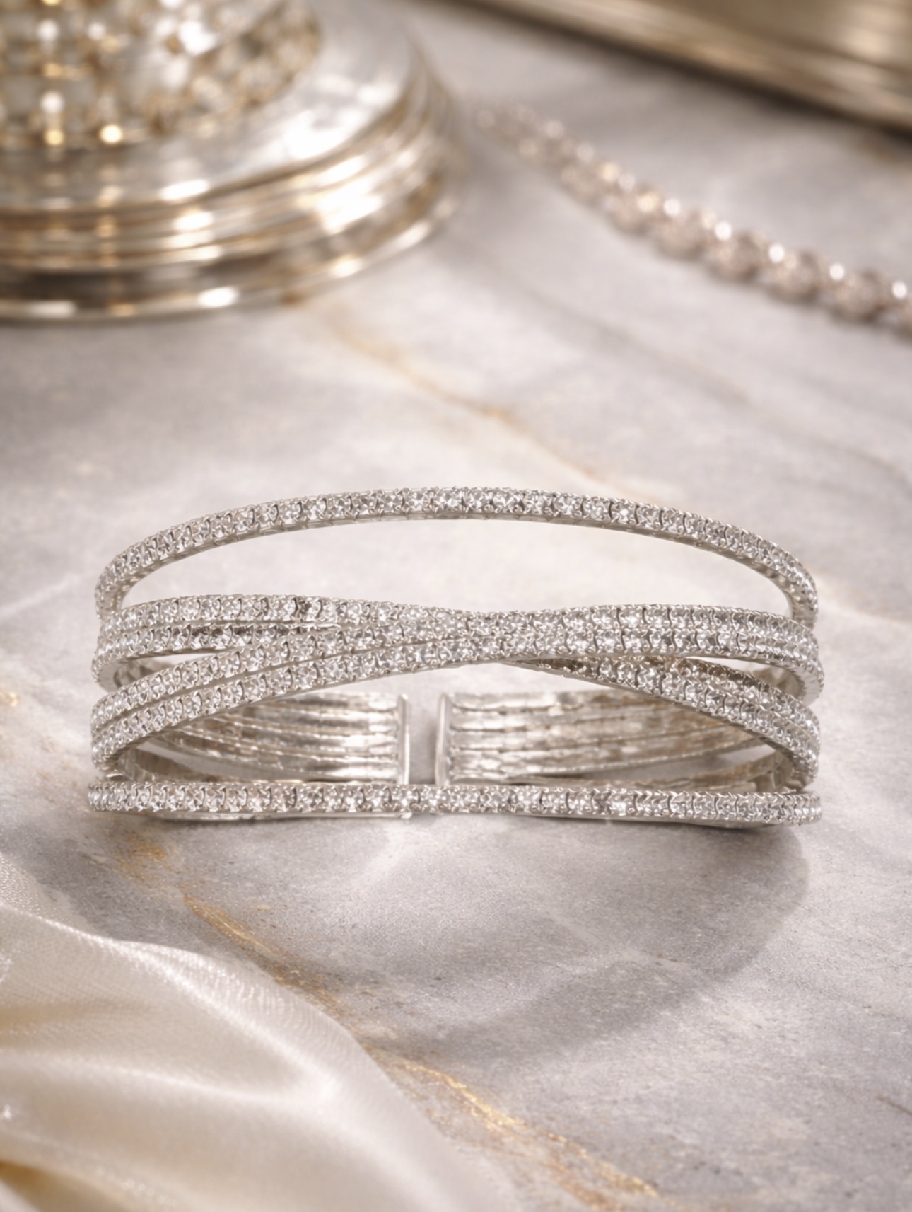 Otwarta konstrukcja ułatwia zakładanie i dopasowanie do nadgarstka, a subtelny połysk cyrkonii przyciąga spojrzenia bez efektu przesady. Idealna jako samodzielny akcent lub w połączeniu z inną biżuterią.