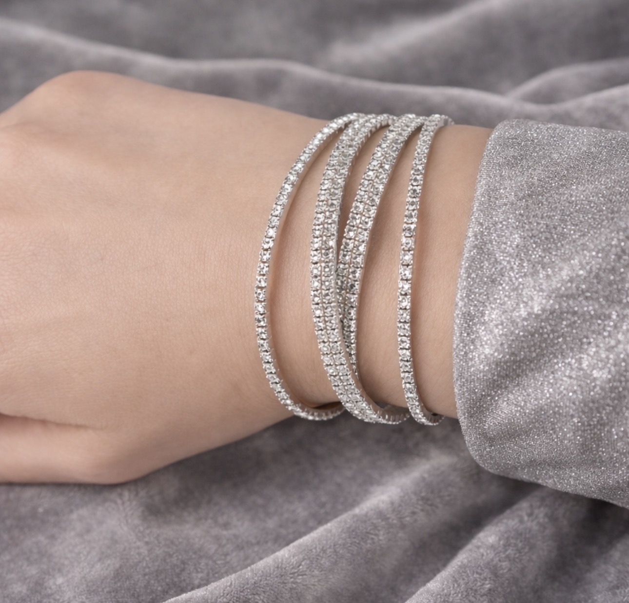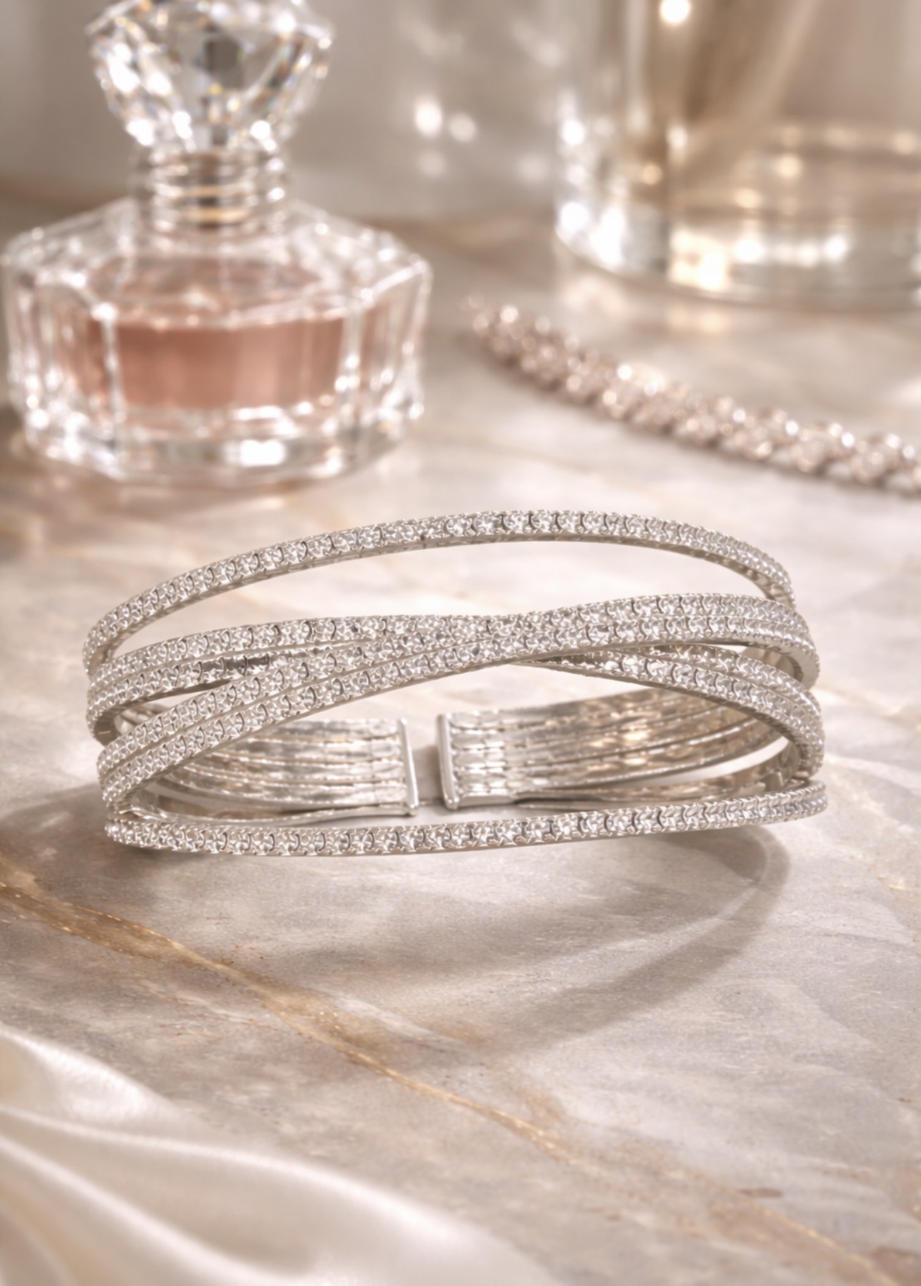 Stylowa bransoletka sztywna w kolorze srebrnym, ozdobiona kilkoma rzędami drobnych, pięknie mieniących się cyrkonii. Jej elegancka forma sprawia, że doskonale prezentuje się na nadgarstku i dodaje klasy każdej stylizacji – zarówno codziennej, jak i wieczorowej.